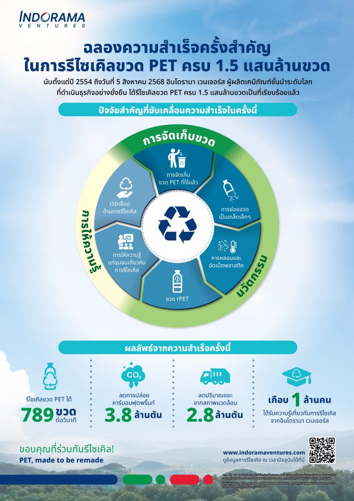 กรุงเทพฯ ประเทศไทย – 5 สิงหาคม 2568 – บริษัท อินโดรามา เวนเจอร์ส จำกัด (มหาชน) ผู้ผลิตเคมีภัณฑ์ชั้นนำระดับโลกที่ดำเนินธุรกิจอย่างยั่งยืน ประกาศความสำเร็จครั้งสำคัญด้วยการรีไซเคิลขวด PET ที่ผ่านการใช้แล้วครบ 1.5 แสนล้านขวด นับตั้งแต่เริ่มดำเนินการในปี 2554 ความสำเร็จครั้งสำคัญนี้ตอกย้ำความมุ่งมั่นในระยะยาวของบริษัทในการดำเนินงานตามหลักเศรษฐกิจหมุนเวียน และการลงทุนอย่างต่อเนื่องในโครงสร้างพื้นฐานด้านการรีไซเคิลทั่วโลก